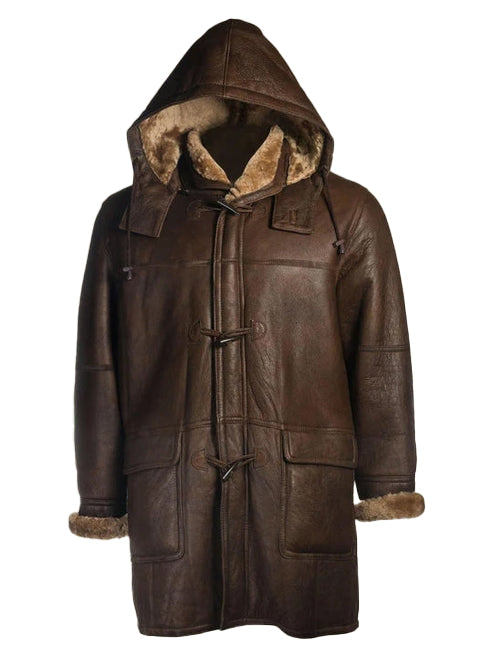 Crafted from 100% genuine brown leather and lined with plush real shearling, this coat offers unbeatable insulation against harsh winter winds. The attached hood provides extra protection, making it perfect for snowy days or outdoor adventures.