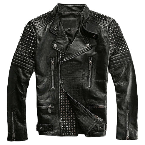 Men’s Black Punk Cowhide Leather Jacket with Silver Studs